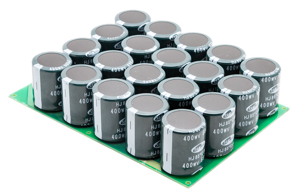 Батарея из 20 небольших электролитических конденсаторов, ёмкостью 1000 мкФ каждый, соединенных параллельно. Заменяют обычные конденсаторы большой емкости.