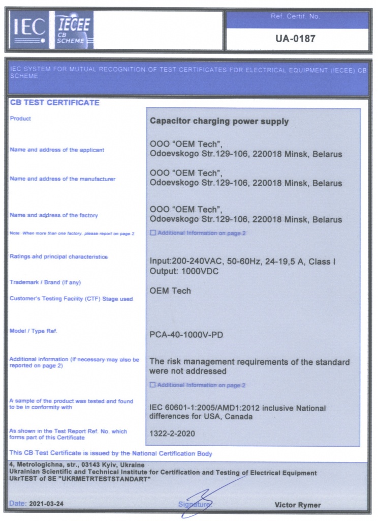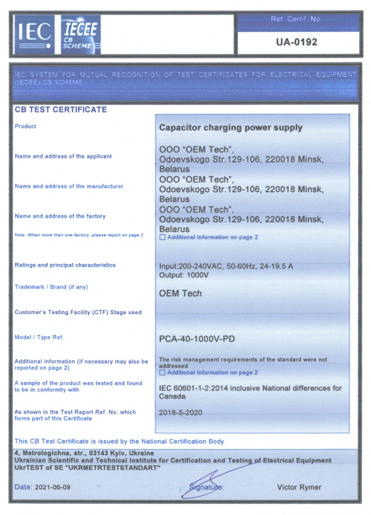 Данные о новых сертификатах для PCA‑40‑1000V‑PD (сертификат по электробезопасности, сертификат по EMC) и PCA‑40‑1300V‑СD (сертификат по электробезопасности) размещены в описании продуктов и в соответствующих разделах сайта.